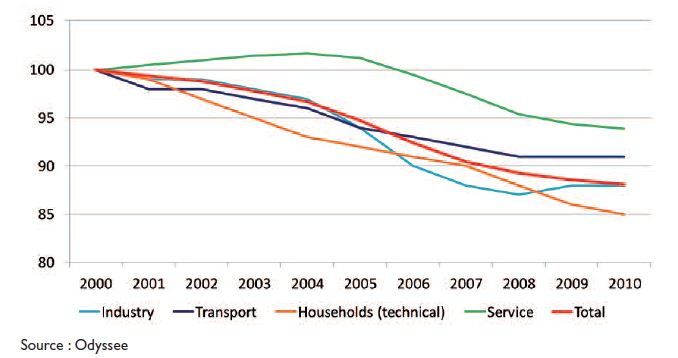 L’analyse d’Odyssee-Mure montre que les progrès en matière d'intensité énergétique en UE diminuent, passant de -1,5 % par an entre 2000 et 2007 à -0,6 % par an depuis 2007. Autrement dit, il y a de moins en moins de progrès dans ce domaine, contrairement à ce que l'on pourrait penser. Dans le secteur de l’industrie et des transports, la tendance s’est même inversée. En effet, la stagnation, voire récession économique provoque une baisse de charge des industries qui ne fonctionnent plus à pleine capacité, et une baisse du taux de remplissage des transports de marchandise (camions, trains ou avions moins remplis).