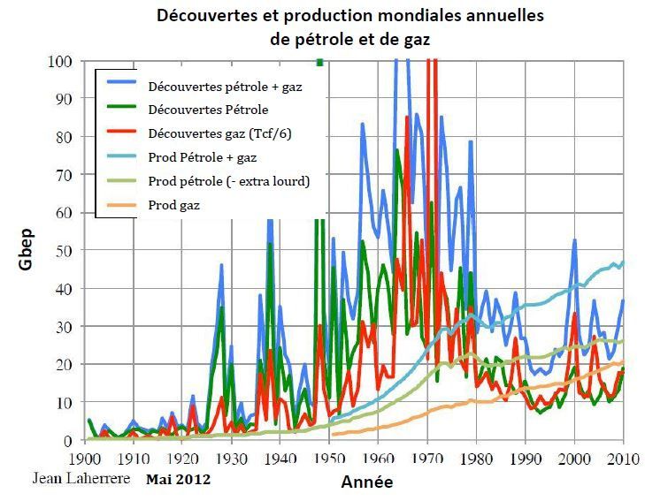 Comme après chaque passage d'un pic, il y a une descente et depuis 1980, les découvertes ne dépassent plus les 50 Gbep/an, dont 20 Gb de pétrole alors que le monde en consomme chaque année plus de 32 Gb !