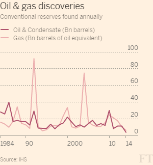 Depuis 2010, la baisse des volumes découverts est constante malgré les prix très élevés et les investissements colossaux. En 2014, le total des découvertes est estimé à 16 Gbep, c'est-à-dire le plus bas niveau depuis 1952. Autrement dit, le monde a découvert, en 2014, trois fois moins d'hydrocarbures qu'il n'en a consommé