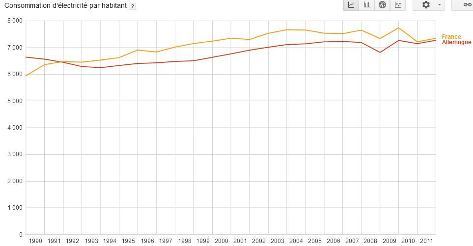 Évolutions comparées de la consommation d'électricité par habitant en France et en Allemagne. Données Banque Mondiale, Graphique Google