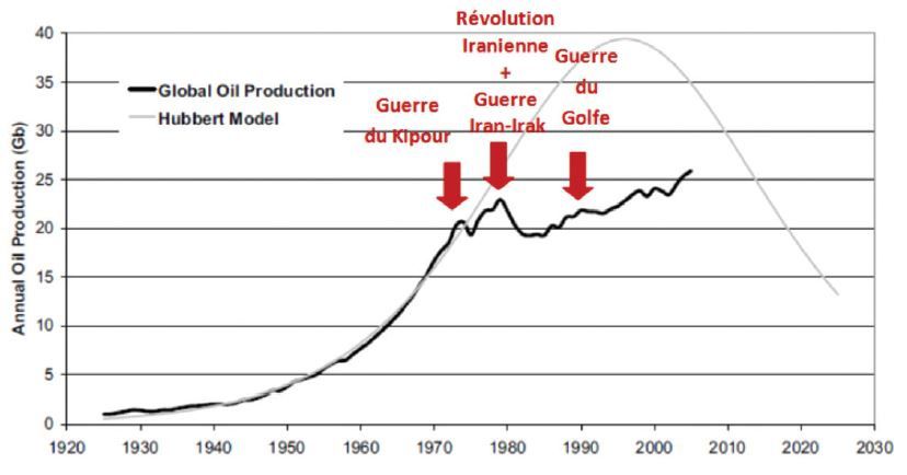 Le très célèbre rapport Meadows "The limits to growth" et les prévisions de MK Hubbert ont été publiées au début des années 1970. En fait, le rapport Meadows a été publié en 1972. Lorsque l'on regarde l'évolution de la production pétrolière jusqu'en 1972 (voir graphique ci-après), on ne peut se douter qu'en 1973, un choc pétrolier viendra bouleverser le monde entier et ralentir durablement la croissance de la production pétrolière. En l'absence des différents chocs pétroliers, nous aurions en effet dépassé le pic depuis plusieurs années mais il était impossible pour les auteurs de modéliser de tels événements géopolitiques. Cela ne remet absolument pas en cause la notion de pic, cela reporte juste de quelques années le début du déclin.